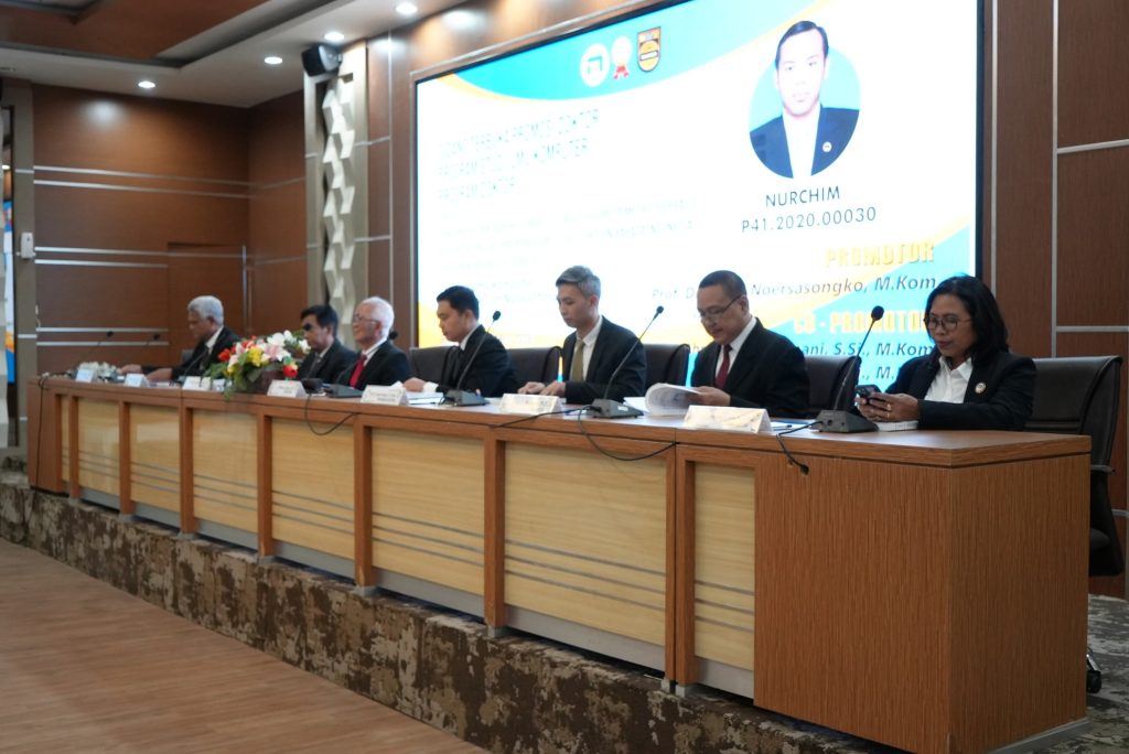 Promovendus Nurchim dibimbing oleh Tim Promotor yaitu Prof. Dr. Ir. Edi Noersasongko. M.Kom (Promotor), Prof. Dr. Ahmad Zainul Fanani,S.Si., M.Kom (Co-Promotor) dan Prof. Dr. Muljono,S.Si., M.Kom (Co-Promotor). Sedangkan Tim Penyanggah terdiri dari: Sri Winarno, Ph.D (Ketua Sidang), Prof. Dr. Taqwa Hariguna, S.T., M.Kom. (Penguji Eksternal / Universitas AMIKOM Purwokerto), Prof. Dr. Ir. Nova Rijati, S.Si, M.Kom, IPU, ASEAN Eng. (Anggota), dan Purwanto, Ph. D. (Anggota).