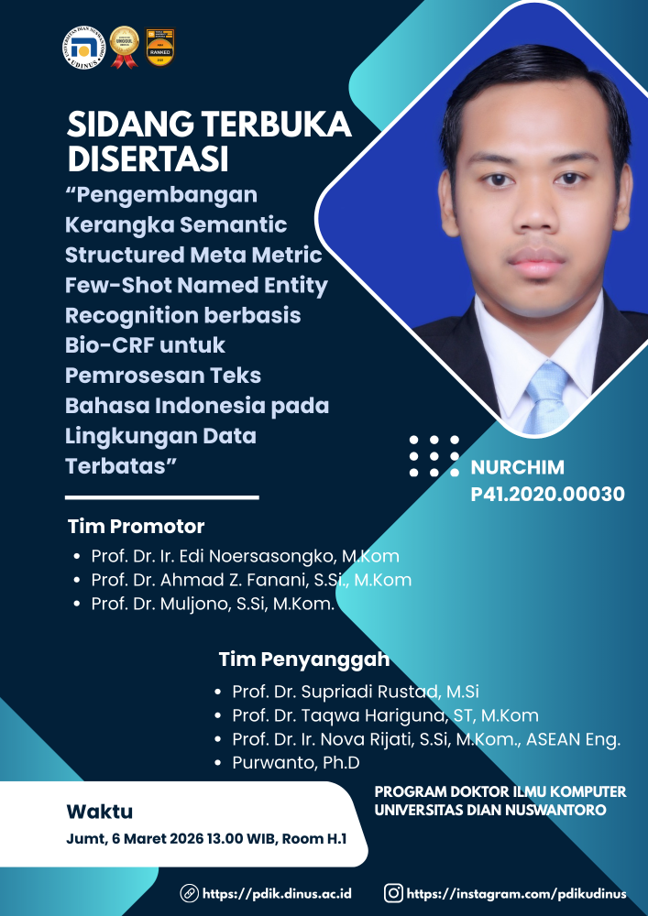 - Judul Disertasi: “Pengembangan Kerangka Semantic Structured Meta Metric Few-Shot Named Entity Recognition berbasis Bio-CRF untuk Pemrosesan Teks Bahasa Indonesia pada Lingkungan Data Terbatas”